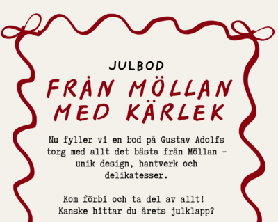 I år samverkar vi med Malmö Citysamverkan. Under fyra dagar i två omgångar har vi en julbod på Gustav Adolfs torg, där Möllans kreatörer, designer och idkare kan komma och sälja sina produkter. Och vi vill gärna ha med dig!